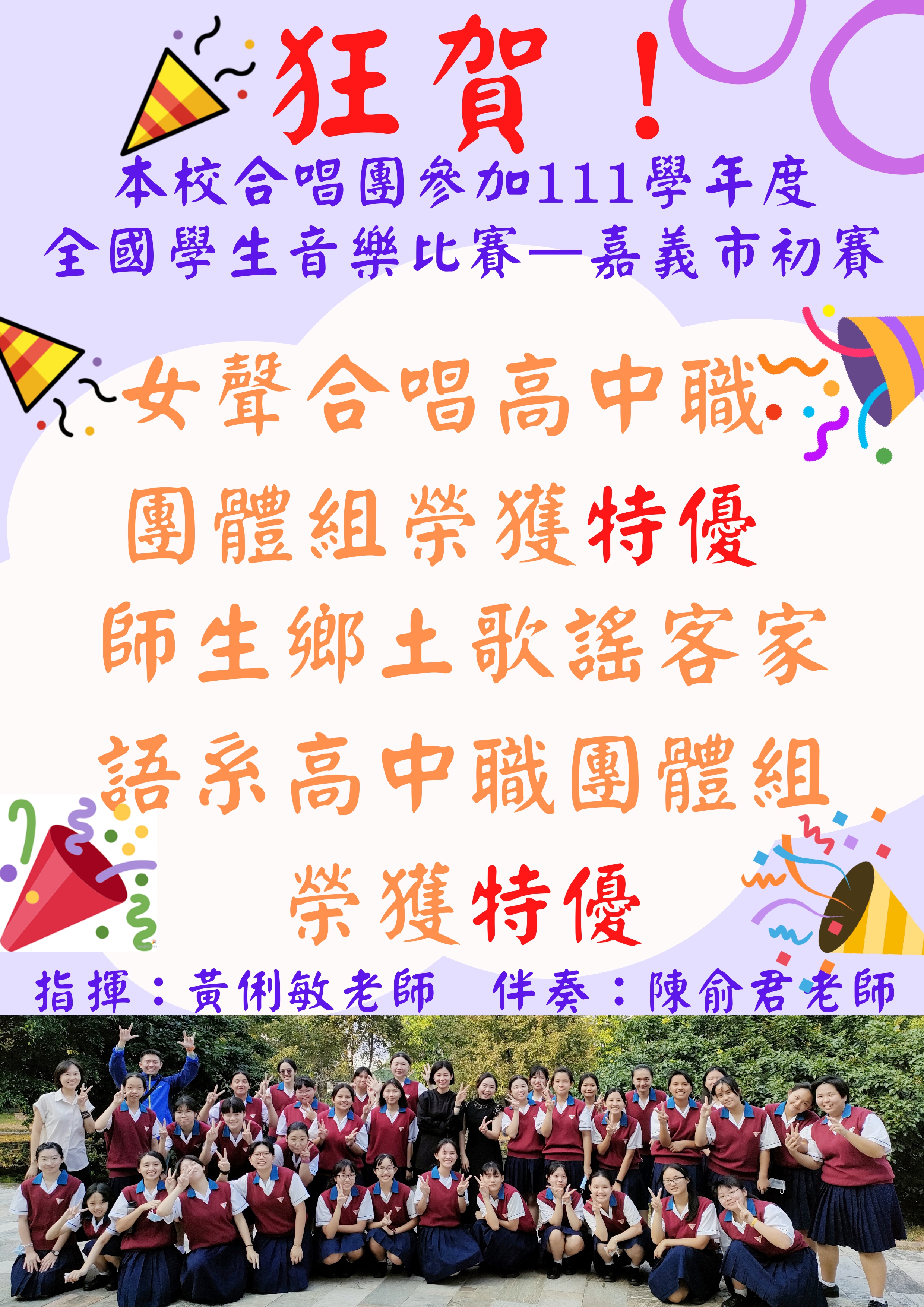 狂賀!本校合唱團勇奪111學年度嘉義市學生音樂初賽【雙特優】!