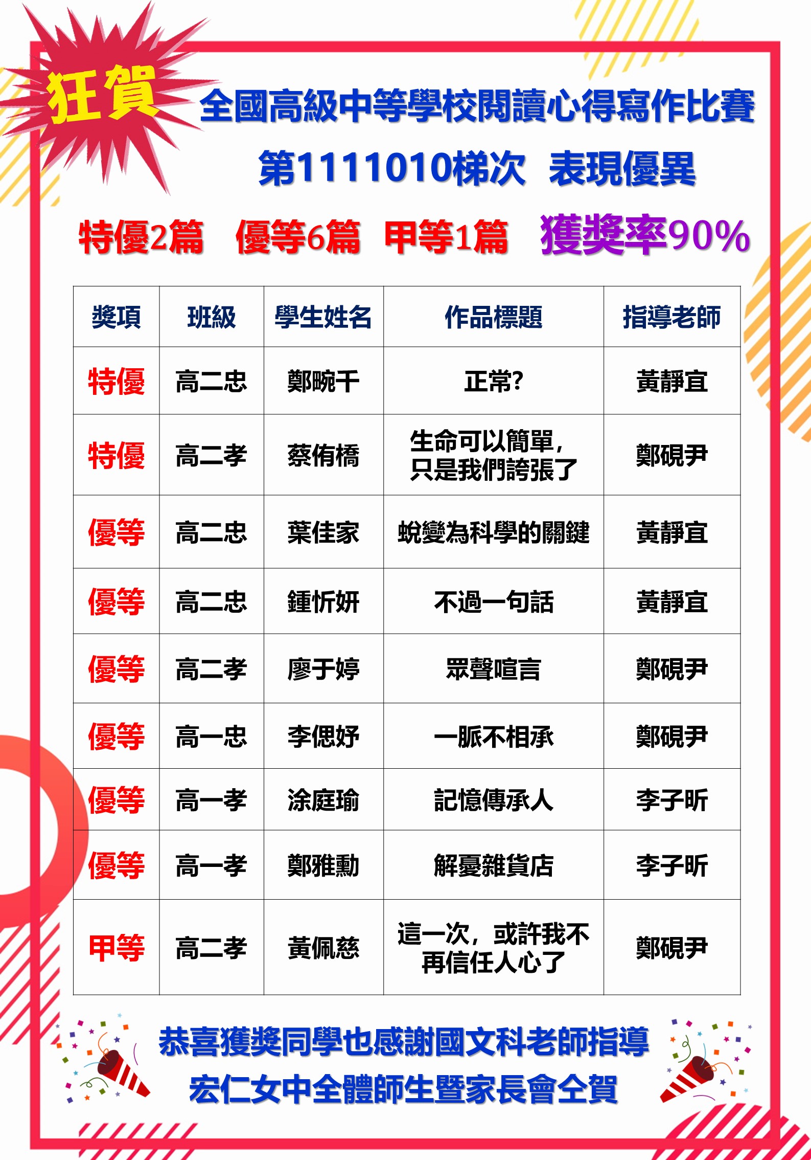 恭賀本校參加全國111學年度第1111010梯次閱讀心得競賽 表現優異