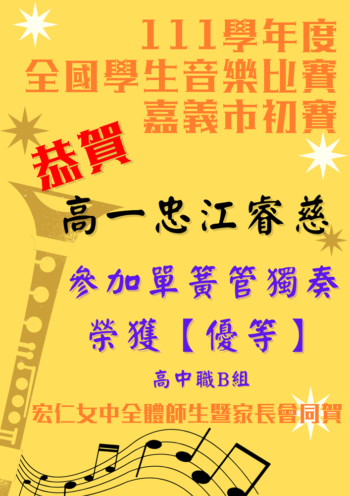 恭賀!高一忠江睿慈參加111學年全國學生音樂比賽嘉義市初賽【單簧管獨奏】榮獲優等!