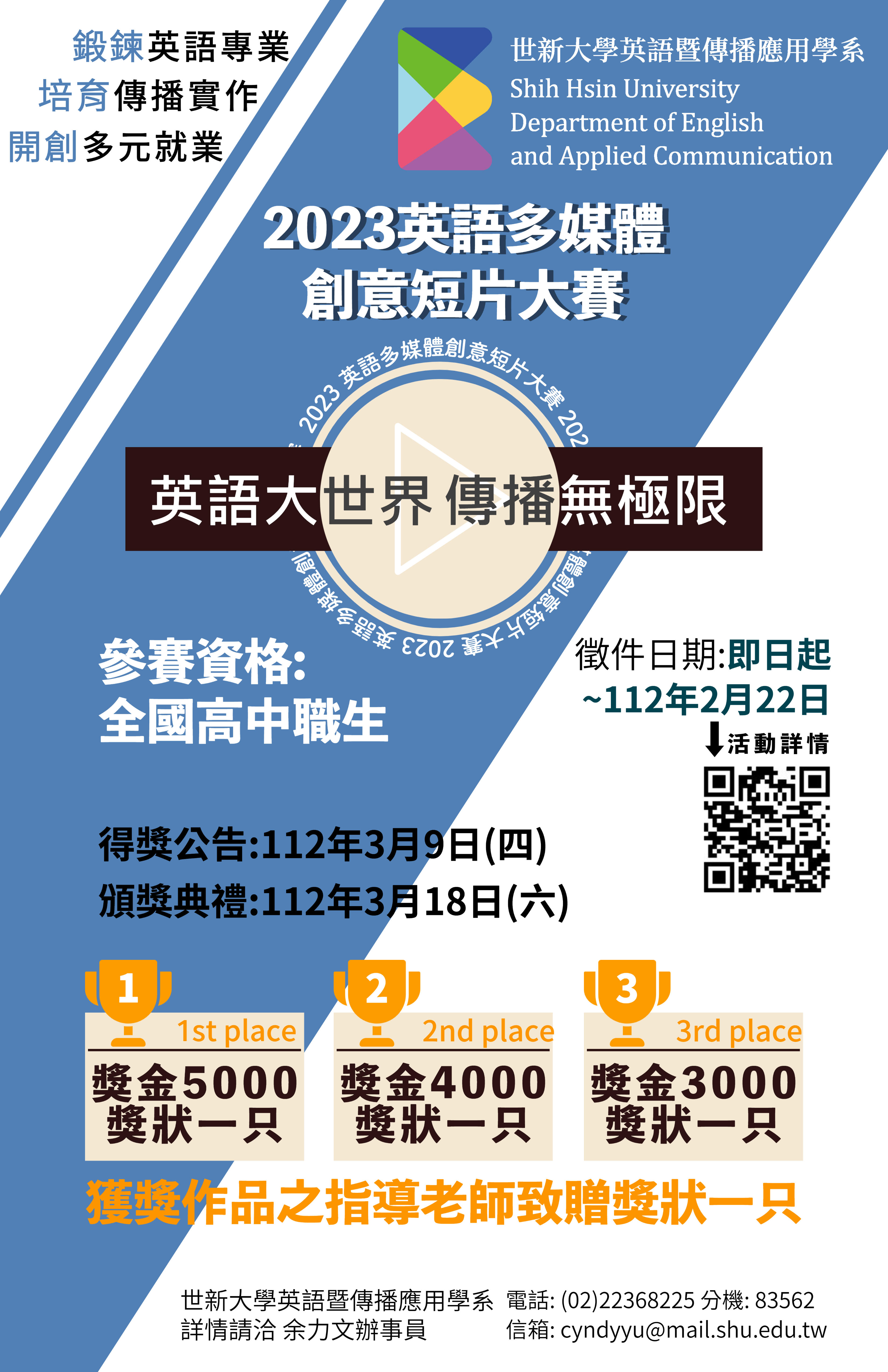 主旨:為本校英語暨傳播應用學系辦理2023 英語多媒體創意短片大賽「英語大世界傳播無極限」活動,敬請轉知相關訊息並鼓勵學生踴躍參與,請查照。 說明: 一、收件時間:即日起至112年2月22日(星期三)。 二、活動網址:https://reurl.cc/EX6dng 三、檢附比賽辦法與海報各1份。