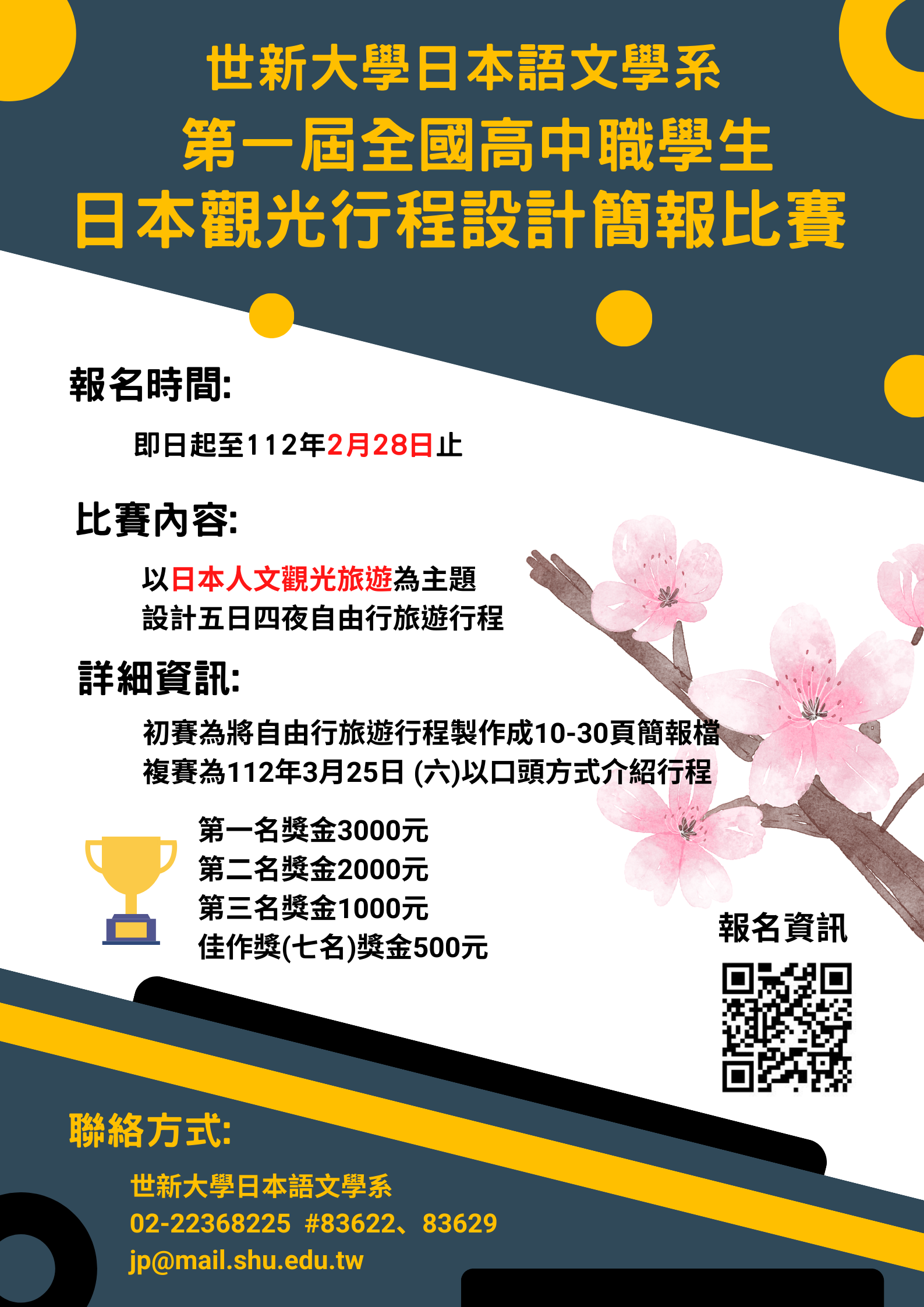 主旨:檢送本校日本語文學系辦理「2023年第一屆全國高中職學生日本觀光行程設計簡報比賽」簡章及活動海報,如說明,敬請推薦學生參加,請查照。