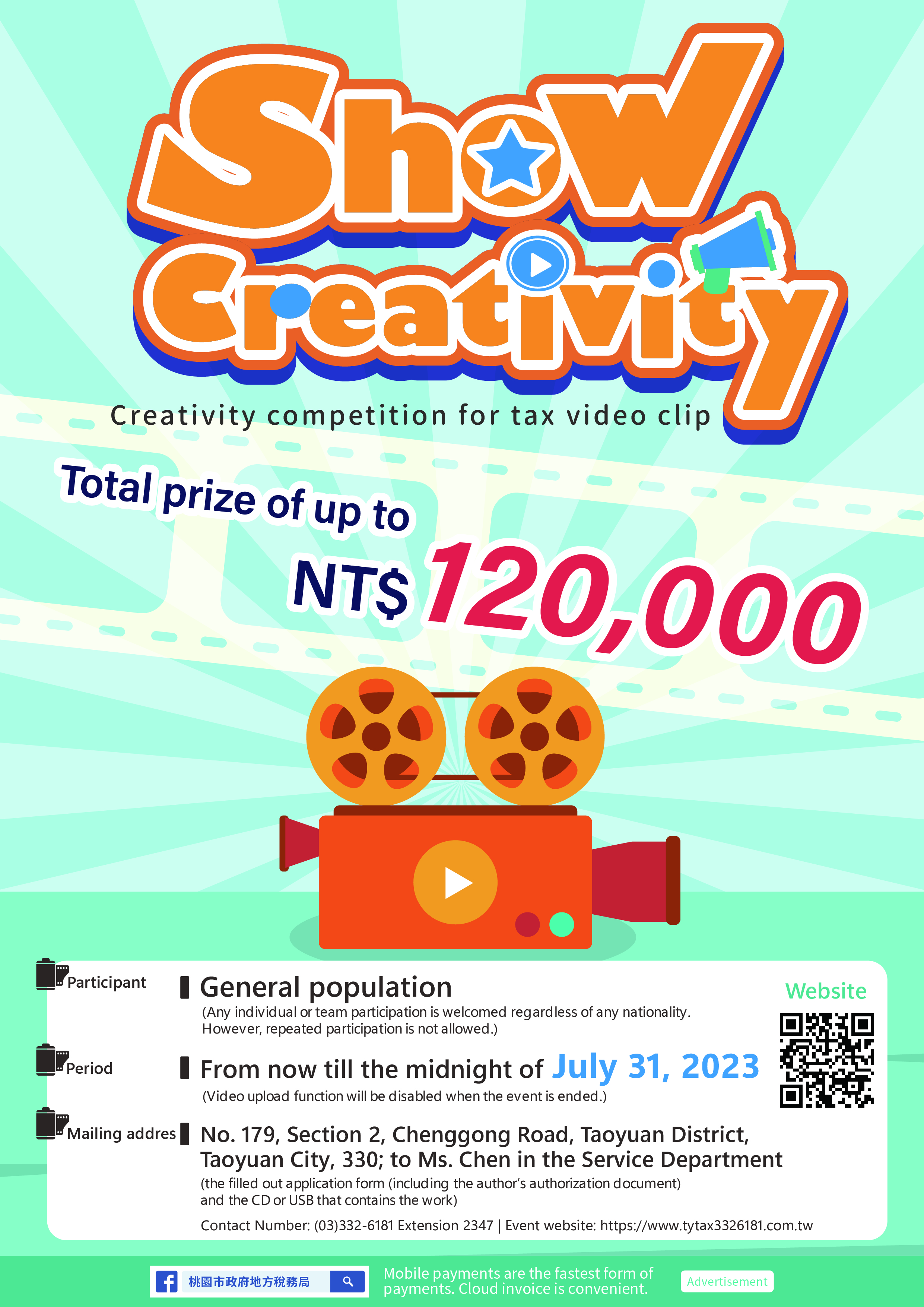 主旨:檢送本局舉辦112年「稅創藝」租稅短片(微電影、動畫)創作競賽海報(中、英文版)及活動辦法各1份,請協助於貴校網站公告活動訊息宣導,請查照。