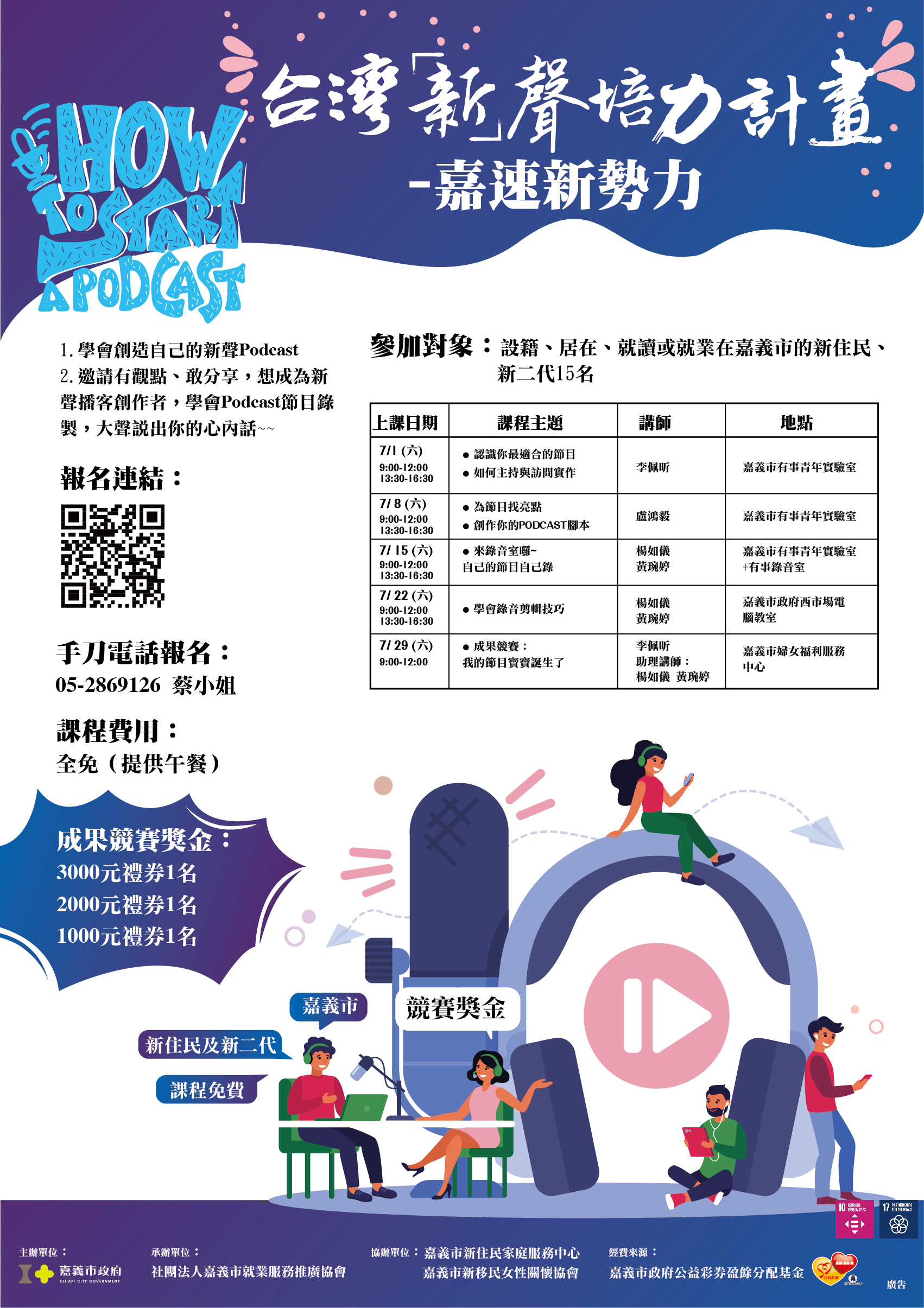 (一)「台灣『新』聲培力計畫-嘉速新勢力」課程即日起開始報名,邀請有觀點、敢分享,想成為新聲播客的你,學會Podcast節目企劃錄製,大聲說出你的心內話!