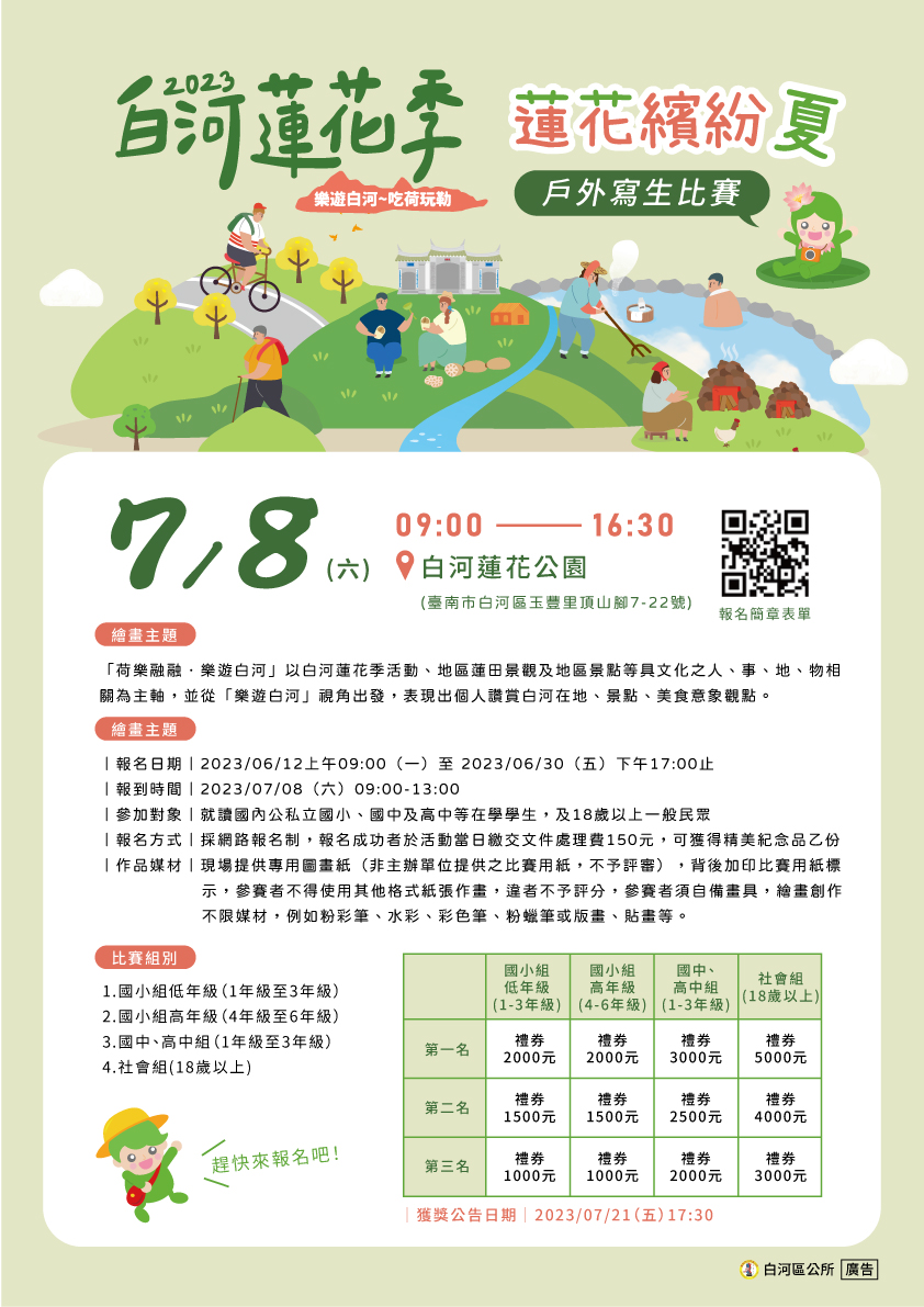 主旨:函轉臺南市白河區公所辦理「2023白河蓮花季系列活動『蓮花繽紛夏戶外寫生比賽』」活動賽事報名簡章與報名海報各1份,請貴校惠予公告周知及協助宣傳,請查照。