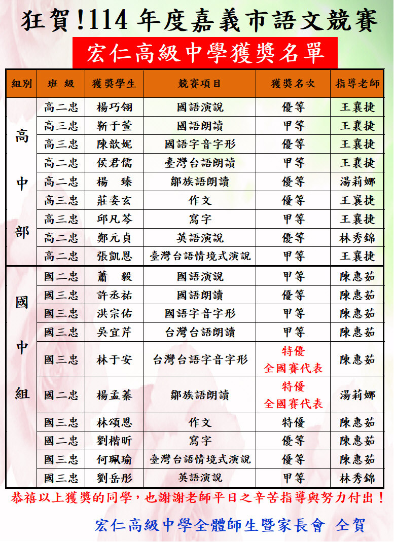 恭賀宏仁中學參加114年語文競賽,榮獲佳績!